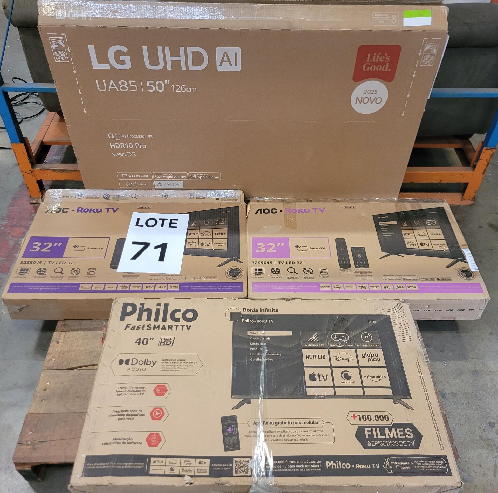 1 TV 50 POLEGAS LG UHD AI 50UA855PSA 1 TV PHILCO 40 A FHD 1 TV AOC 32 32S5045/78G ROKU 1 TV AOC 32 32S5045/78G ROKU