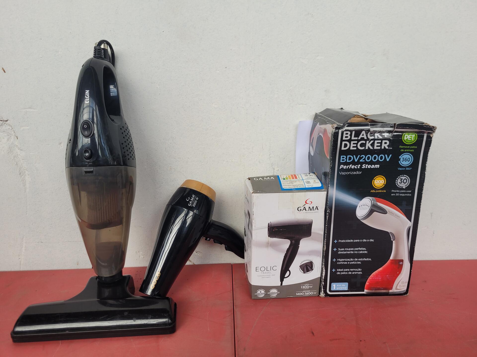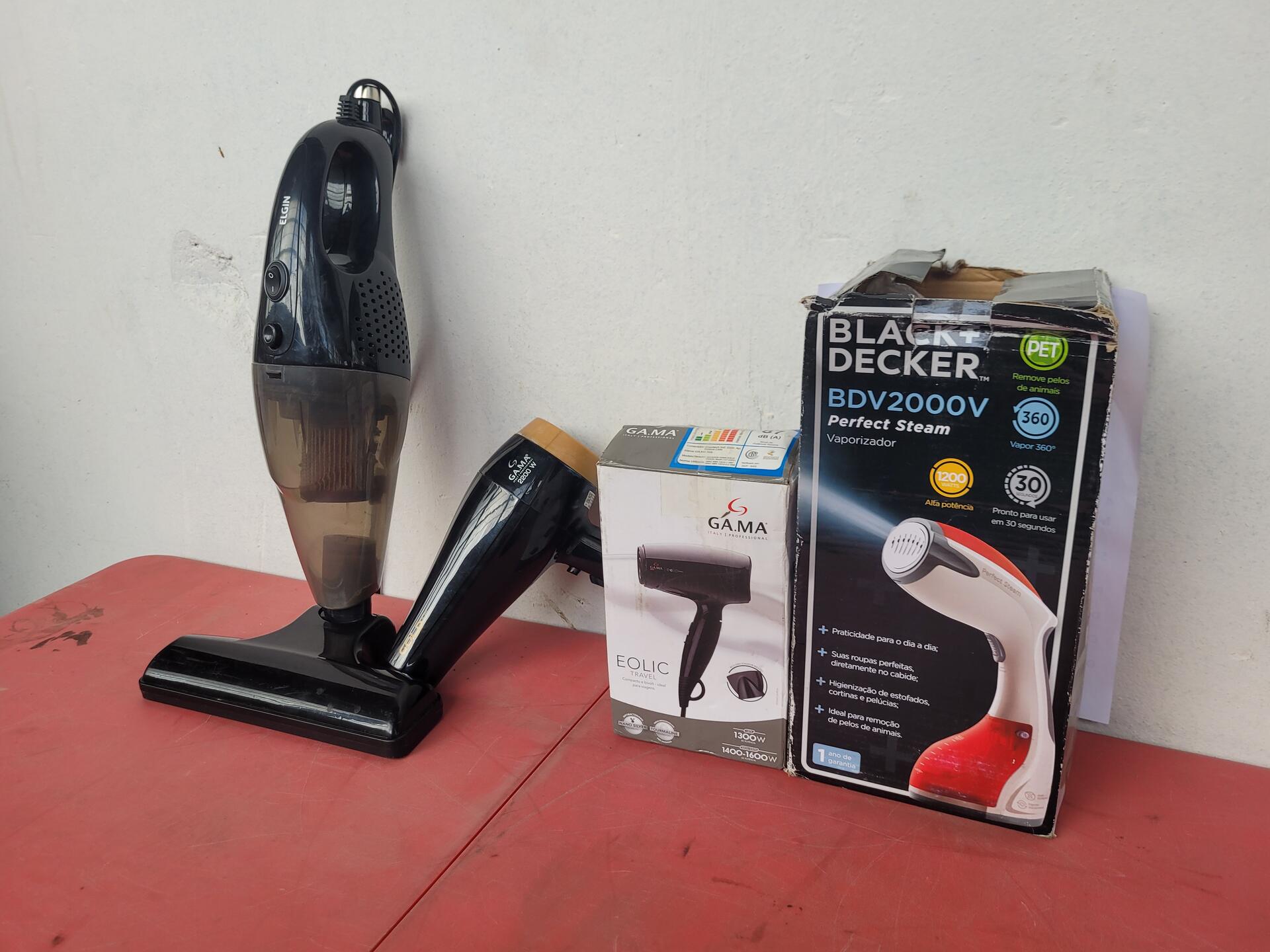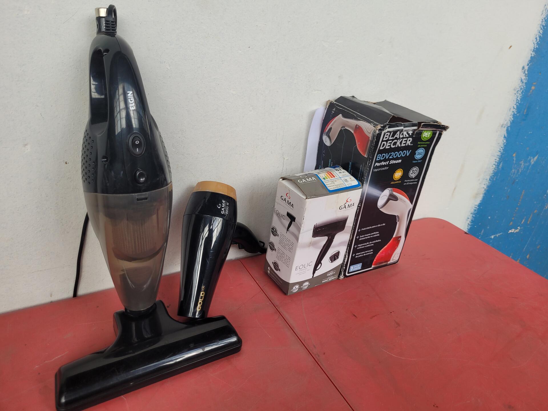 1 SECADOR DE CABELOS GOLD GAMA 220V - 1 SECADOR EOLIC TRAVEL GAMA BIVOLT - 1 ASPIRADOR DE PÓ PERFECT CLEAN ELGIN 127V - 1 VAPORIZADOR BDV 2000V BLACK DECKER 127V - NO ESTADO QUE SE ENCONTRA
