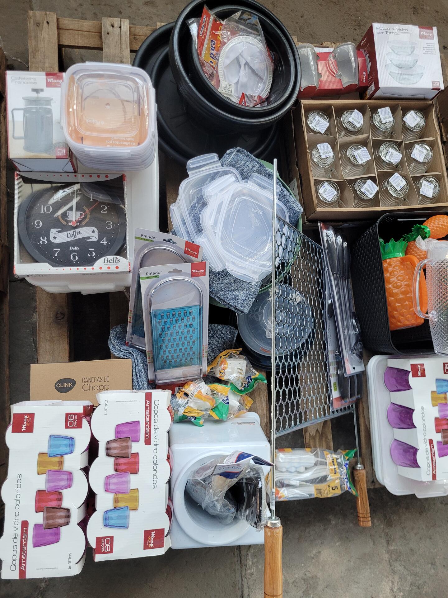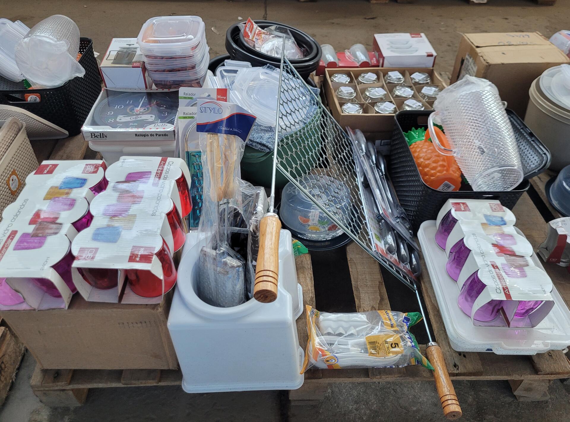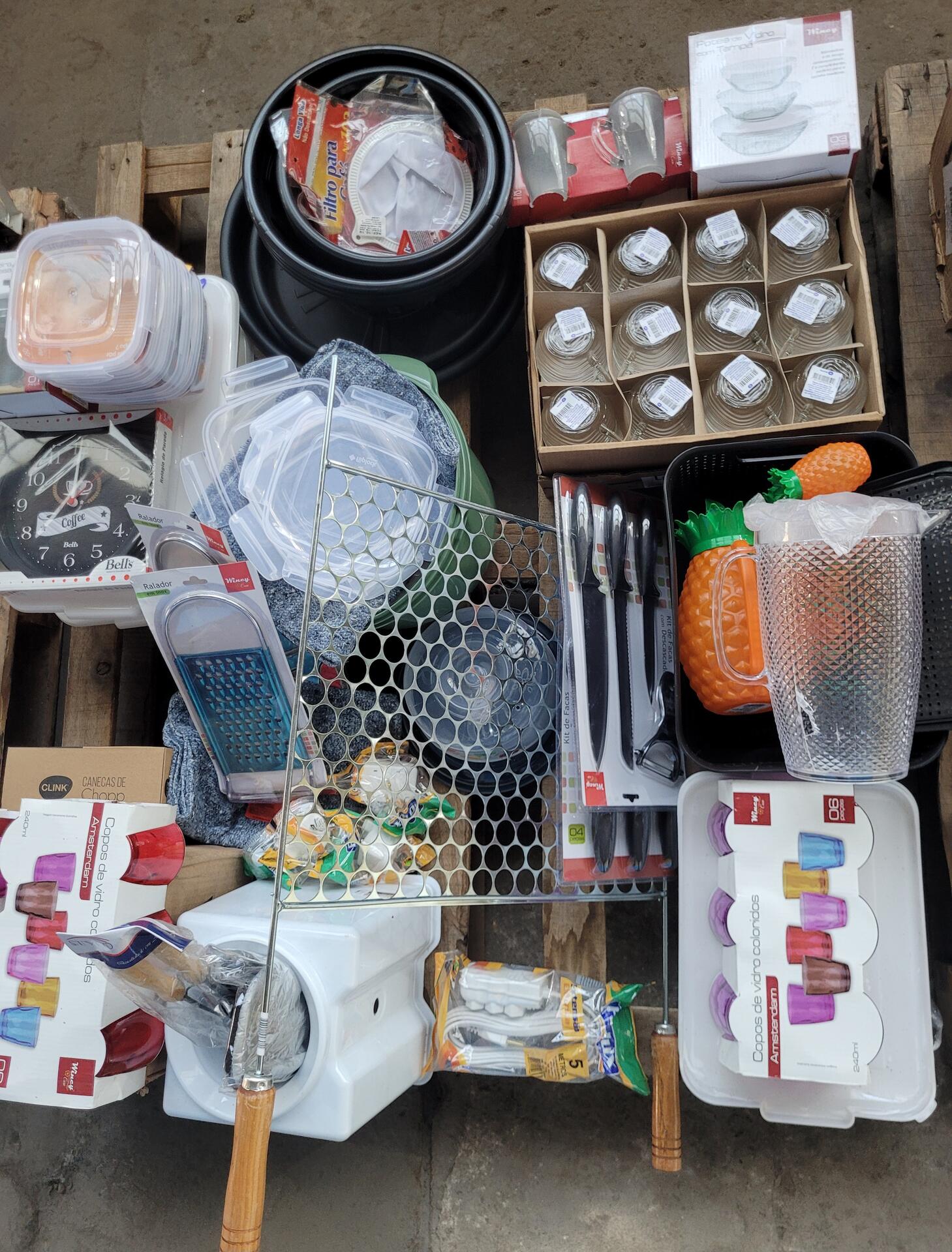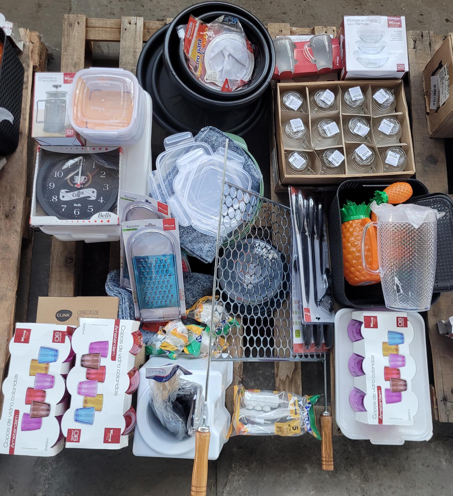BEBEDOURO - RELÓGIO DE PAREDE - JARRAS DE VIDRO - KIT TALHERES - POTES - VASILHAS - JOGO DE COPOS - JOGO DE XÍCARAS - RALADOR INOX - BEBEDOURO - PANOS - GRELHA DE CHURRASQUEIRA - ADAPTADOR DE TOMADA - KIT FACAS - ENTRE OUTROS